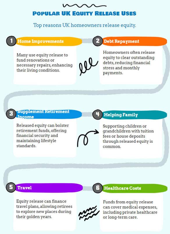 - Equity release funds are commonly used for home improvements, debt consolidation, supplementing retirement income, covering care costs, and assisting family members financially, such as with home purchase deposits.